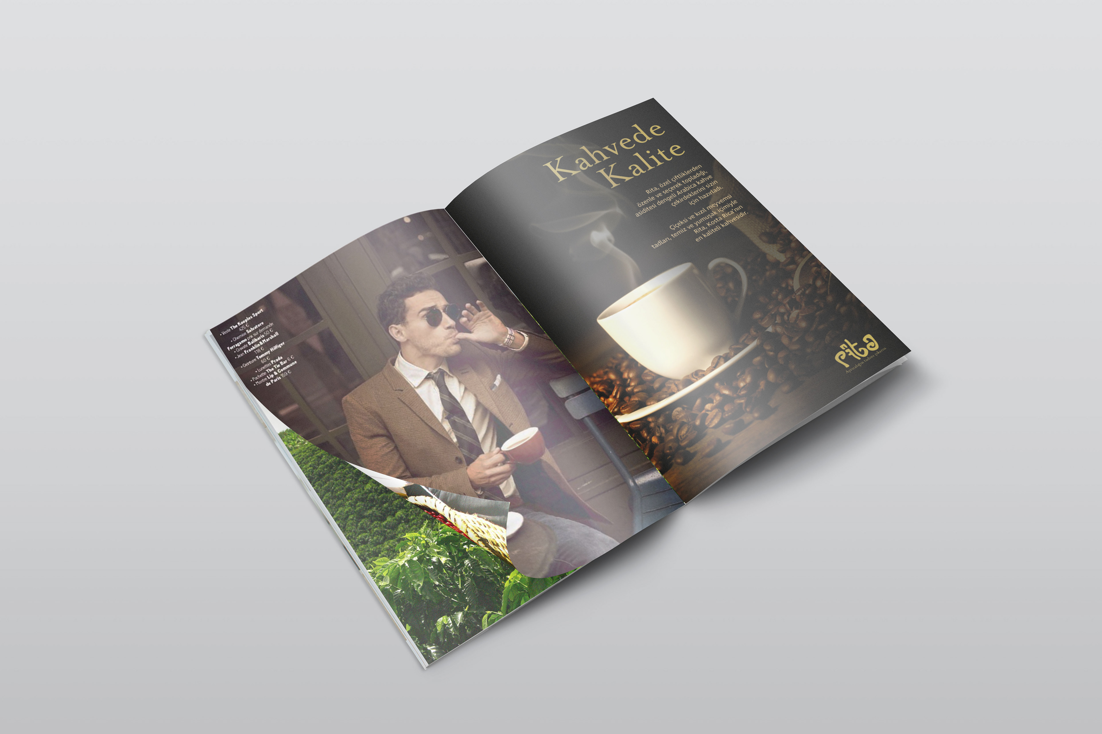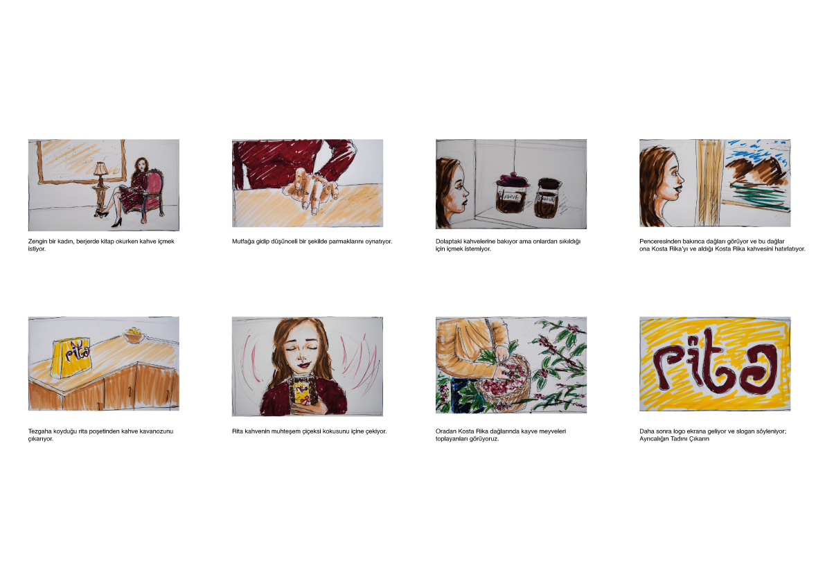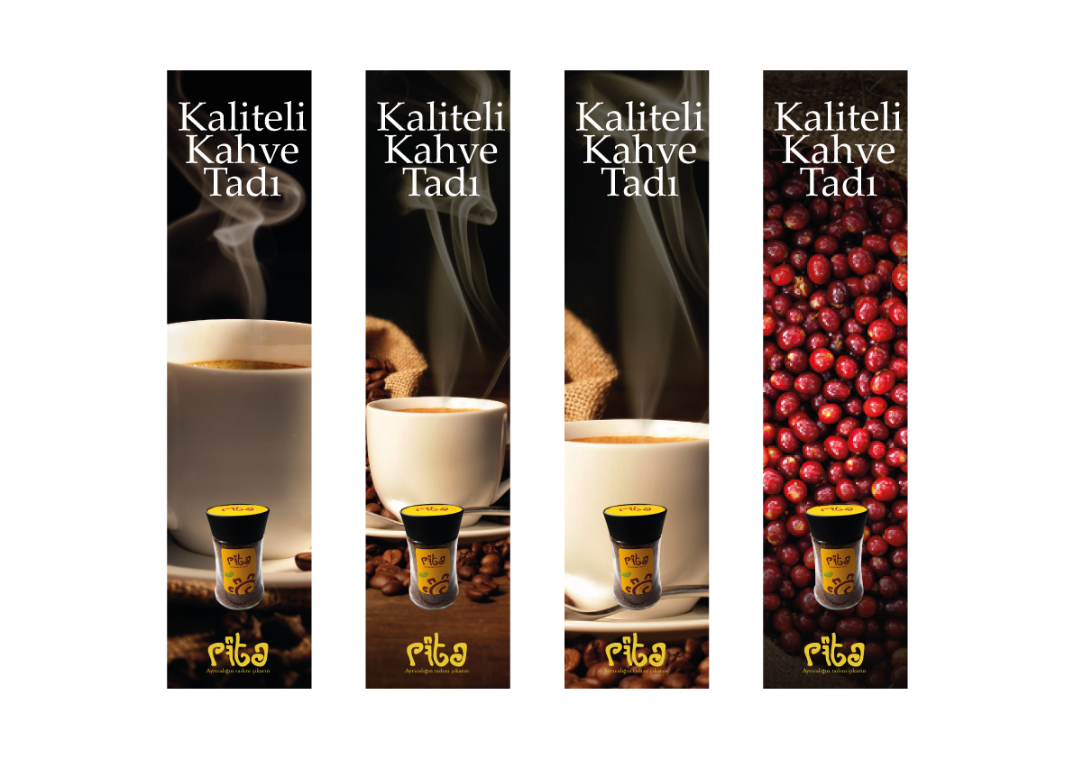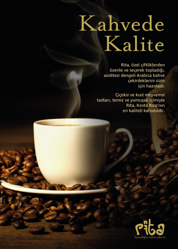 Kahve markam: Rita Kosta Rika'da üretilen Arabica kahveleri satıyor. Üst sınıf gelir düzeyindeki kişilere hitap ediyor. Logotype Banner Basın İlanı Bilboard ve Raket Storyboard Yaratıcı Dış Mekan Kahve Kavanozu Ambalajı